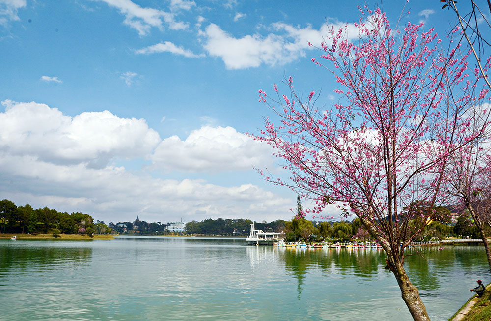Không gian rộng lớn, yên tĩnh của Hồ Tuyền Lâm trở nên nên thơ hơn khi mai anh đào bung nở ven hồ. Sắc hoa hồng nhẹ hòa cùng mặt nước trong xanh và rừng thông bạt ngàn tạo nên bức tranh thiên nhiên quyến rũ. Dạo bước quanh hồ, du khách có thể cảm nhận rõ không khí trong lành và nhịp sống chậm rãi rất riêng của Đà Lạt.